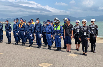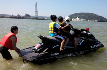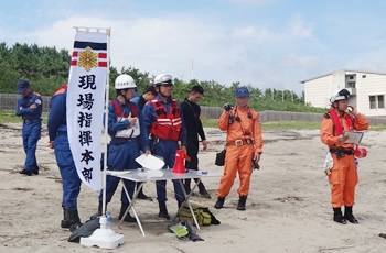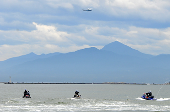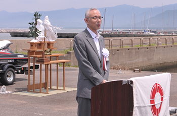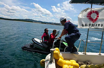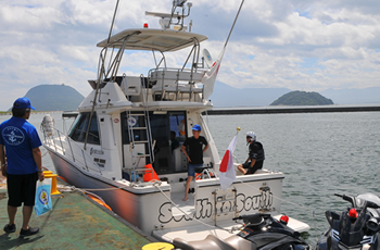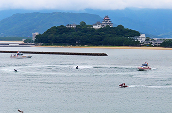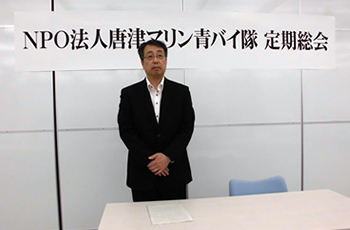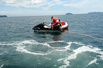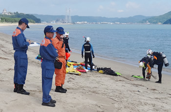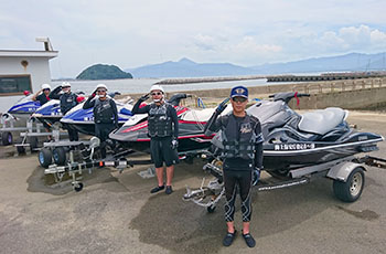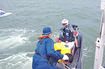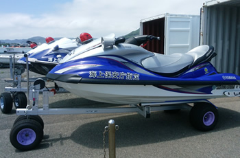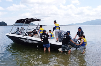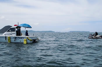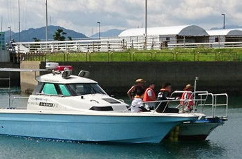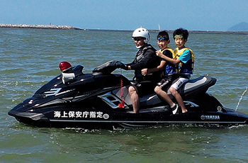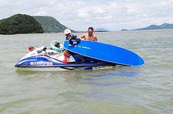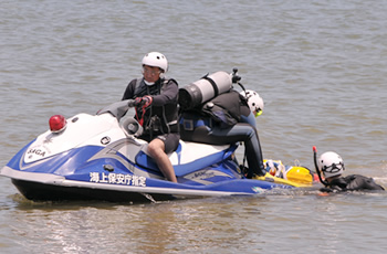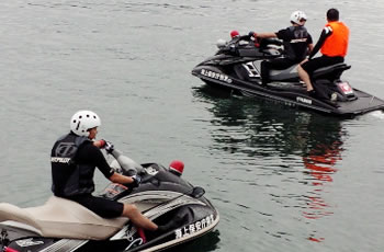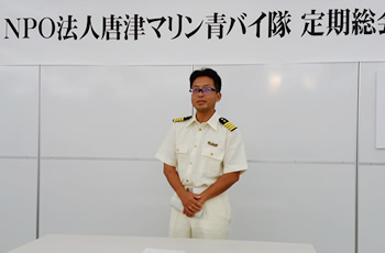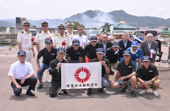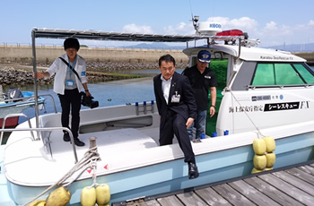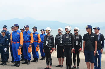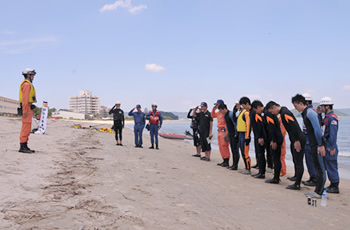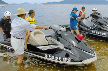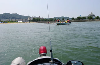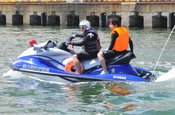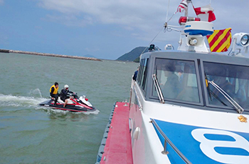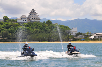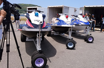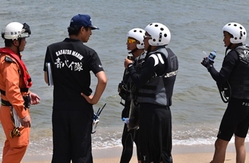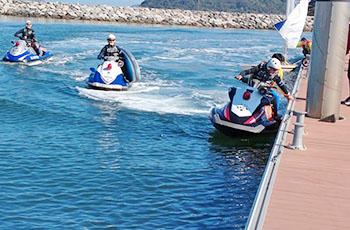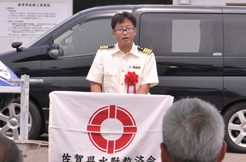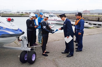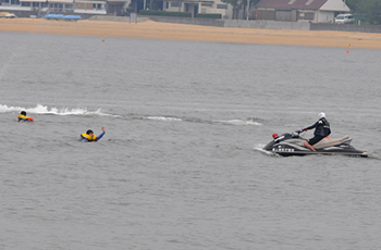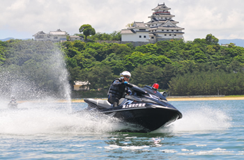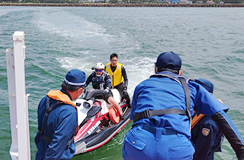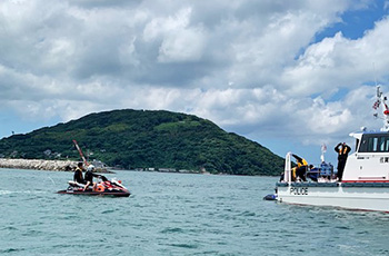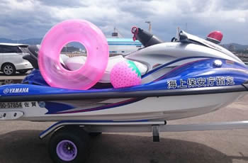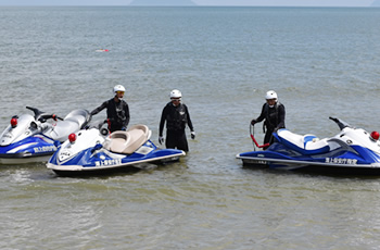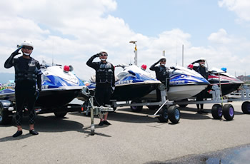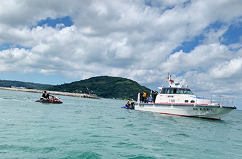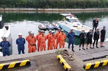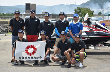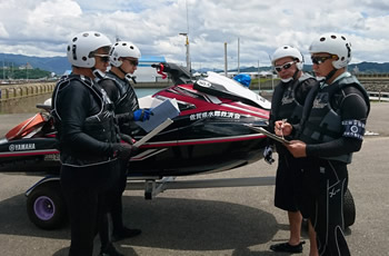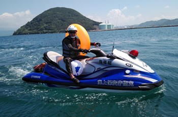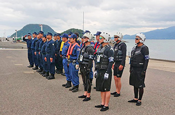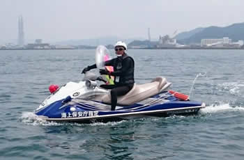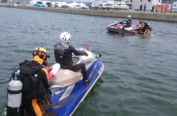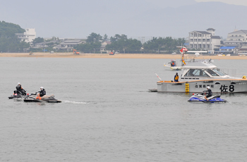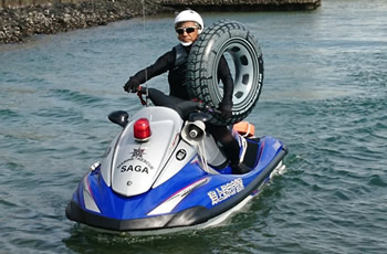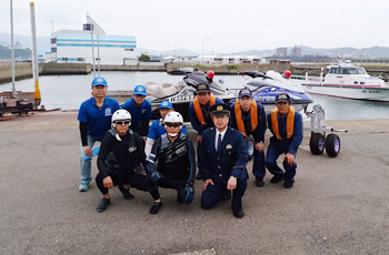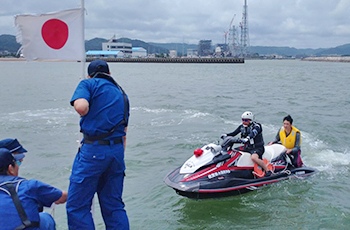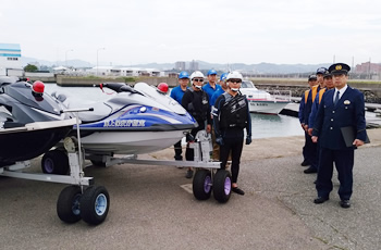 唐津マリン青バイ隊は新理事長 森田 淳氏が唐津警察署長指揮のもと消防署との災害等合同救助訓練を実施した。