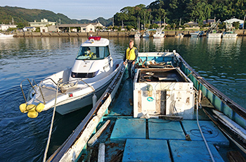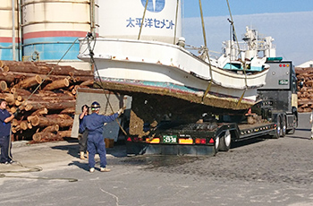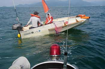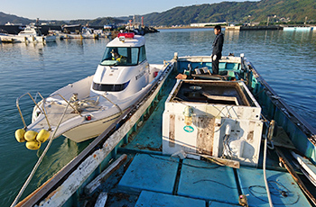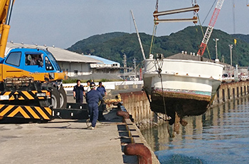 午前7時より唐津港湾内環境保全対策の一環として関係機関へ協力事業を実施した。放置船を青バイ隊パトロール船にて漁港より埠頭まで曳航してクーレーン車で引き揚げトレーラーへ積み込みした。