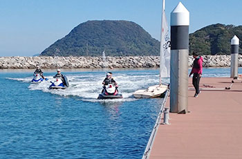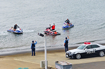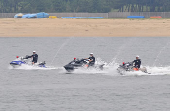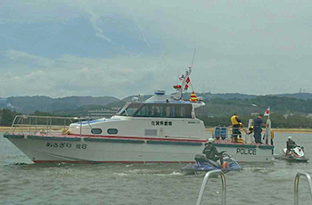 令和4年度唐津市二タ子 佐賀県ヨットハーバー及び西の浜にて、危険行為を行う水上バイクに対する取締訓練! 唐津警察署、地域課、警備課、交通課、パトカー3台、警備艇、【はど】【あさぎり】 佐賀県警察本部、地域警察航空隊ヘリ「かささぎ」 唐津海上保安部、巡視艇「まつかぜ」唐津湾小型船安全協会、唐津湾マリン青バイ隊3艇にて、訓練を2案、実施する。